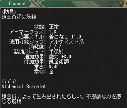 で、もらえるアイテムのひとつに「錬金術師の腕輪」なるものがあるとか?アルケミストマスタリーの条件をクリアしているキャラが装備できるもので「アルケミストマスタリー(以下ALCと略)が必要な技をマスタリー無しで使用可能になる」だそうです。
