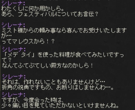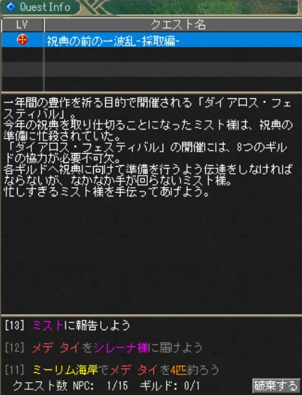 4月28日から5月12日までの間「祝典前の一波乱」というイベントがありました。ダイアロス島上げての収穫祭を行うにあたり、その準備を手伝うという内容です。ギルドマスターの依頼を受けて回ります。