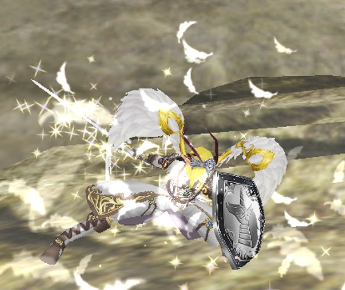 実はこれには没ショットがありまして、こちらですね。このポーズは無茶苦茶好きなのですが「あくまでも服装を見せると考えた場合、立ちポーズの方が妥当」という判断になりました。あと羽根のエフェクトが出すぎてしまいましたので、それも投稿版では抑えました。(笑)
