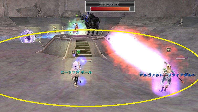 儀式の間は中央に向かって高さが低くなっており、中央にデュラハンが出現する台座があります。この一番低い円の内部、画像の黄色い線の内側だけで戦ってみませんか?